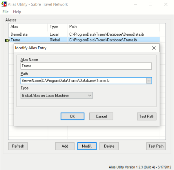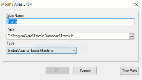To change the path to the database, go to Start | Trams | Alias Utility. Select the Trams Alias, click Modify and update the path to point to the Trams.ib database located on the server using the format required for remote connection via TCP/IP.For Windows 8, Windows 10 or Server 2012 (R2) the default path to your database is: