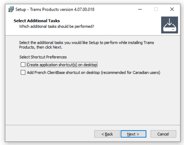 Choose whether to add shortcuts to your desktop. If you’d like to add a shortcut on your desktop for Trams Back Office (and ClientBase, if you chose to install it), then leave the first box checked. If not, uncheck it. The second option, for a French version of ClientBase, is intended for ClientBase users with many French-speaking customers. Check that box if that describes your agency.
