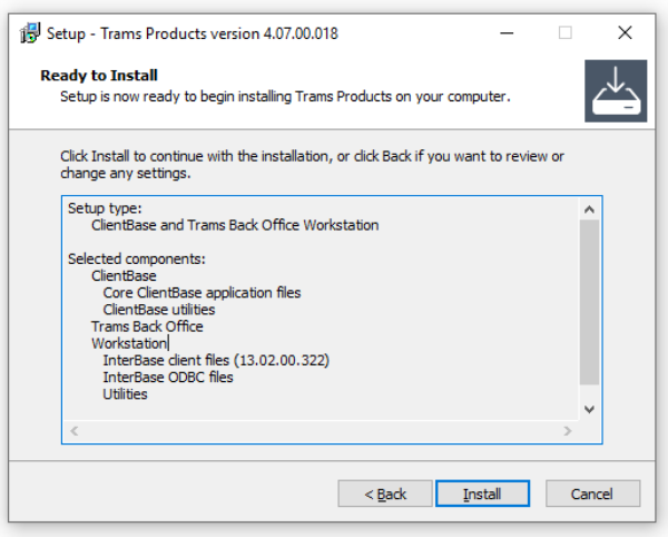 Trams Back Office (and ClientBase, if selected) will be installed in the default destination folder.